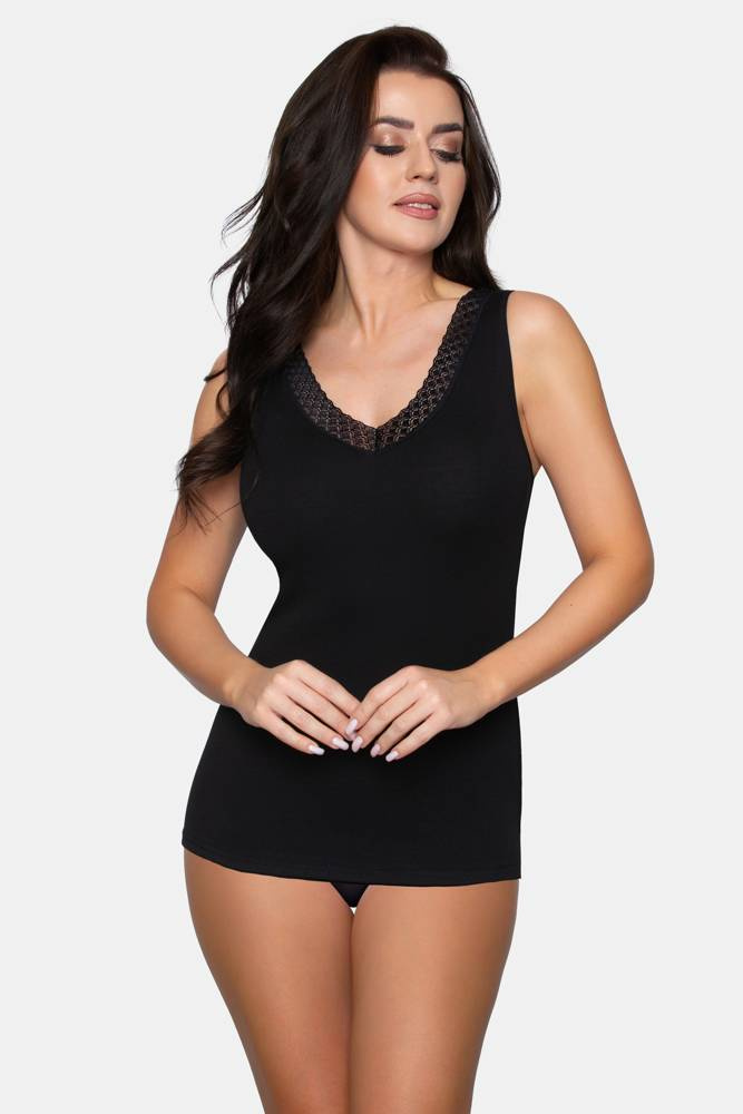 Koszulka na szerokich ramiączkach z dekoltem w szpic zdobionym koronką. Uszyta została z 100% bawełny jest więc świetną propozycją dla osób ceniących naturalność tkanin. Komfort termiczny zapewnia też wysoki tył koszulki, który chroni plecy podczas chłodnych dni.