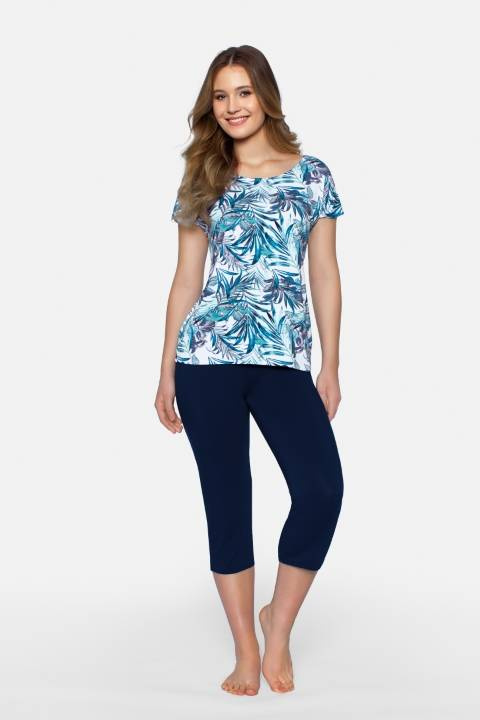Piżama wykonana z miłej wiskozy. W skład kompletu wchodzi bluzka z krótkim rękawem w stonowany liściasty print. Jest ona uszyta z drukowanej wiskozy najwyższej jakości. Klasyczne, proste spodnie 3/4 w granatowym kolorze.
