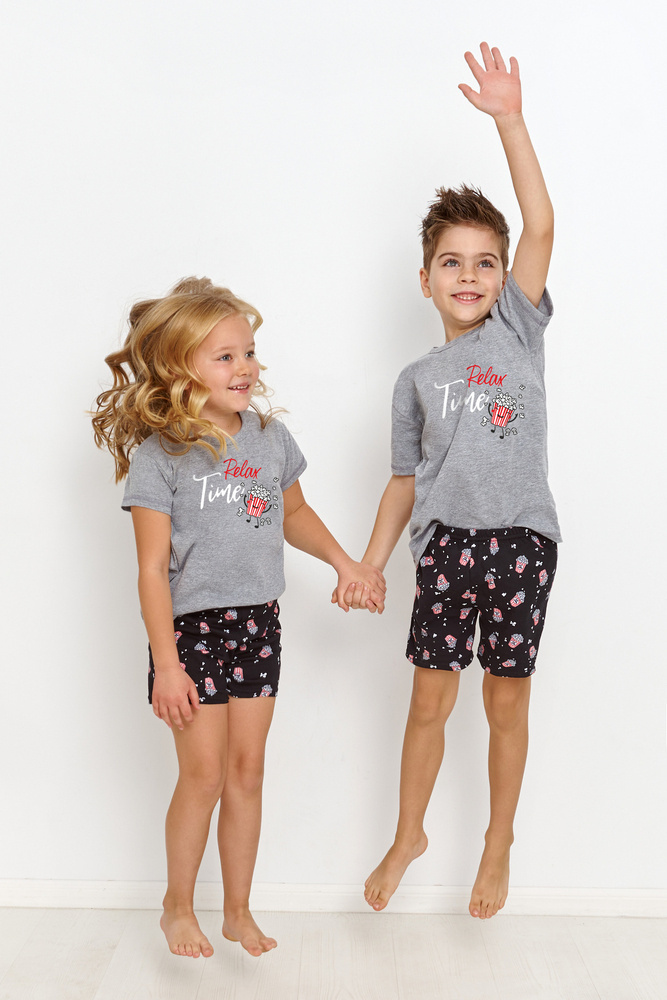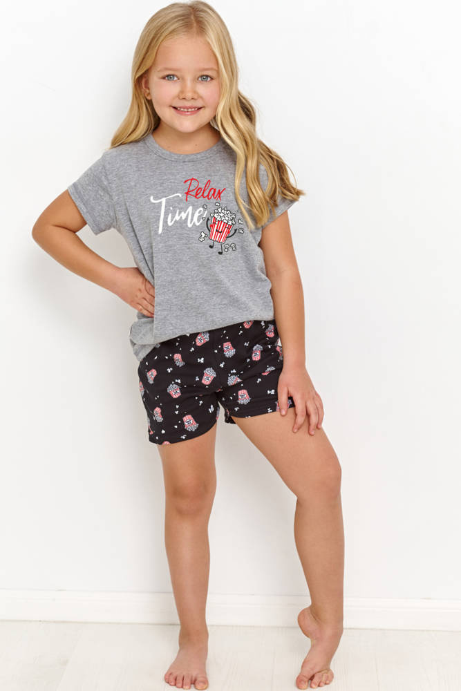 Piżama dziewczęca z krótkim rękawem, uszyta z wysokiej jakości bawełny. Na wysokości klatki piersiowej ozdobny nadruk. Do kompletu krótkie spodenki.