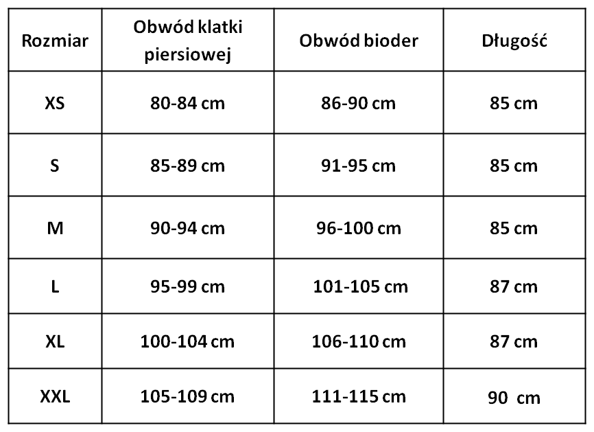 | Rozmiar | Obwód klatki piersiowej | Obwód bioder |