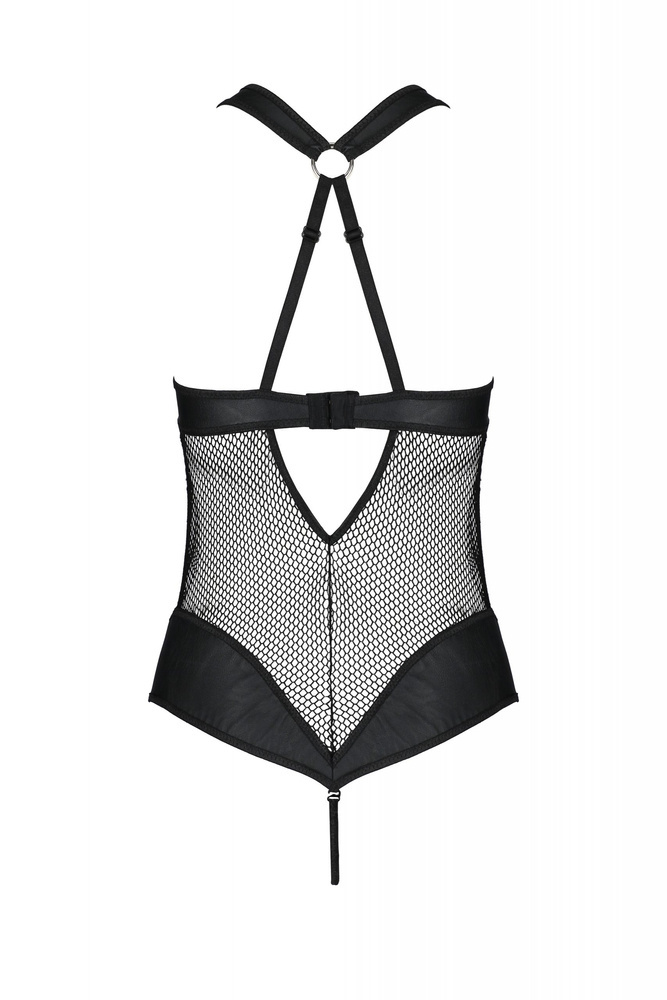 Zmysłowe połączenie skóry z siateczką, która uwodzicielsko opinając się uwydatnia biust i subtelnie odkrywa ciało, a pozłacane łączenia w postaci kółek nadają całości pazur.