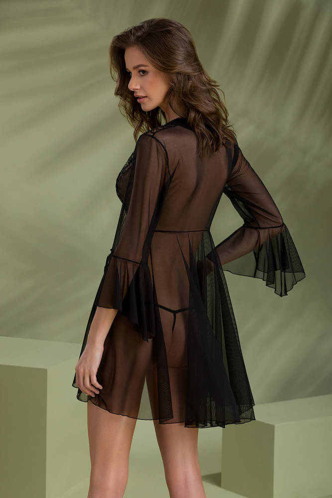 Szlafroczek jest krótki, bardzo wygodny i delikatny. Całość fasonu uzupełnia czarna koronka oraz nietypowe zakończenie rękawków. Kolekcja ta będzie idealna dla klientów, którzy cenią sobie podążanie za trendami, a równocześnie dbają o środowisko naturalne i ekologię. Do produkcji bielizny użyliśmy materiałów z recyklingu potwierdzonych odpowiednimi międzynarodowymi certyfikatami np. GRS