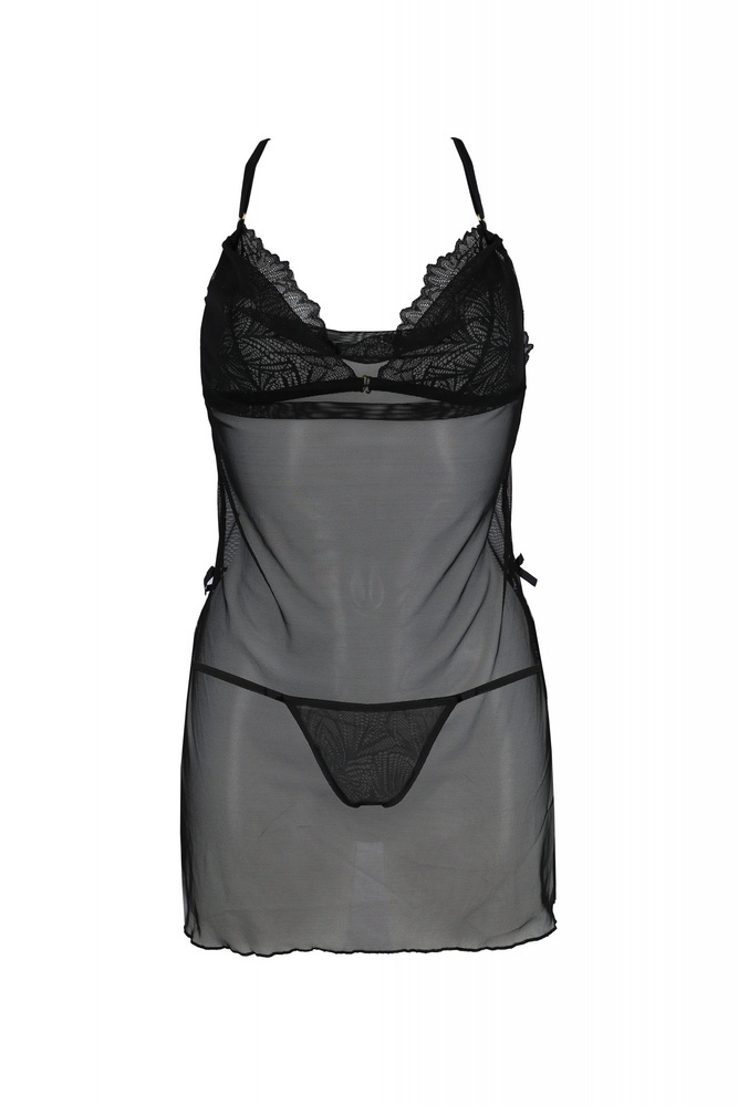 Czarny kolor w połączeniu z delikatną, zwiewną tiulową siateczką i czarnymi dodatkami potrafią zawrócić w głowie. Poznaj koszulkę Deliena w komplecie ze stringami. Zwiewny, zapierający dech w piersiach krój, mnóstwo prześwitów, akcenty w postaci koronki - wszystko to robi oszałamiające wrażenie.