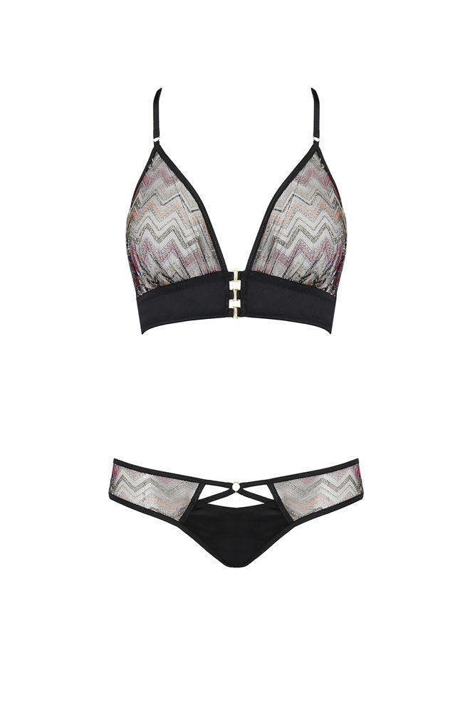 Komplet Lagerta to bielizna dla kobiet, które znudziły się już klasyczną, szablonową bielizną i szukają czegoś nietypowego, ale jednocześnie odpowiedniego do noszenia na co dzień. Symetryczny wzór i interesujące zestawienie kolorów to coś, co zauroczy niejednego. Biustonosz posiada wygodne zapinanie z przodu oraz regulowane ramiączka co pozwala dopasować biustonosz do ciała tak, jak lubisz.