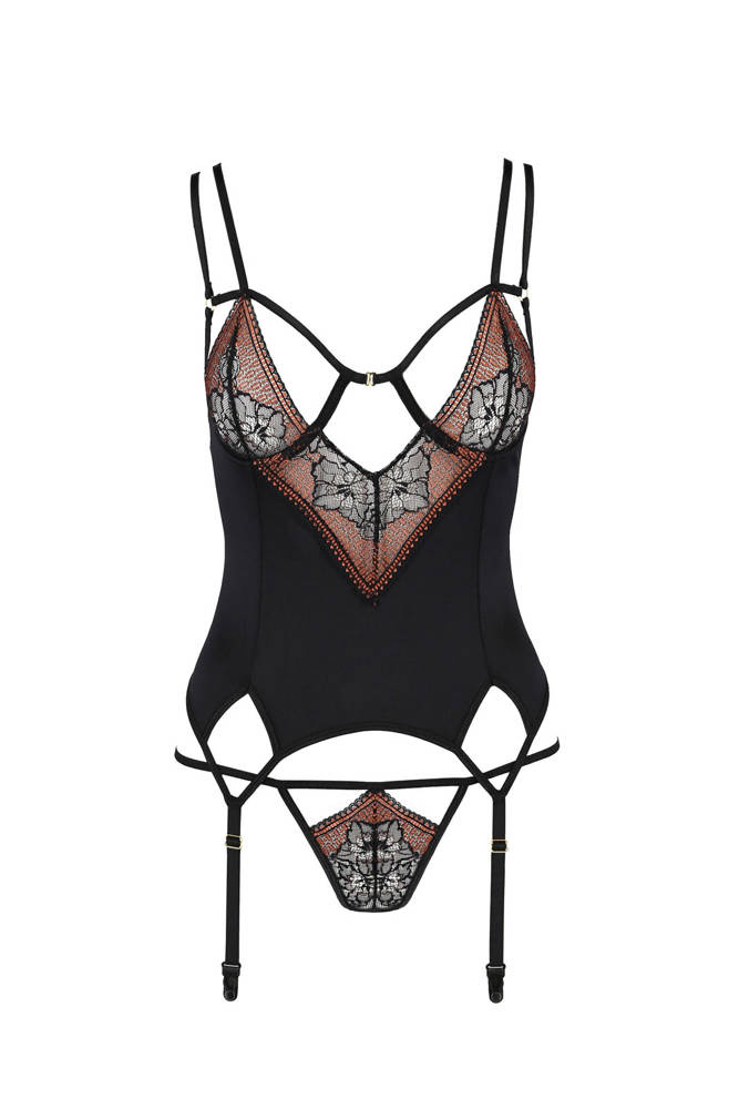Odważne, fantazyjne zdobienia, częściowo odsłonięte miseczki i zmysłowe paski opinające biust to elementy, które składają się na nieco frywolny i zdecydowanie perwersyjny charakter gorsetu. Wysokiej jakości materiał sprawia, że model sprawdzi się idealnie dla odważnych, pewnych siebie kobiet, które cenią sobie zarówno wysoką jakość, wygodę jak i nietypowe rozwiązania w garderobie.