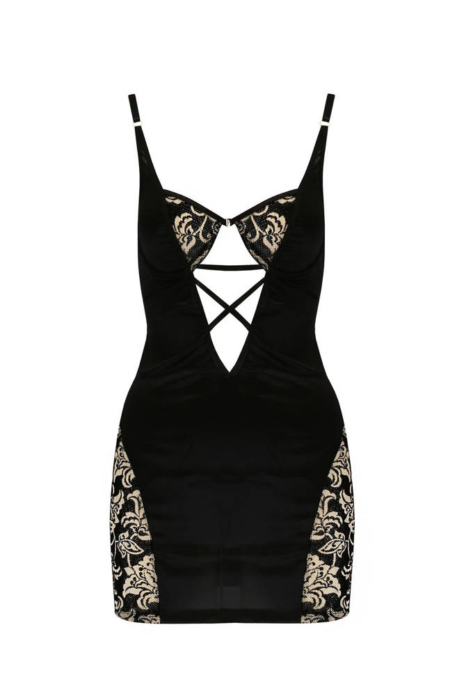 Zmysłowa satyna, opinający krój oraz miseczki wzmocnione fiszbinami- to wszystko sprawia, że koszulka Victoria idealnie dopasowuje się do sylwetki i nadaje jej pożądanego, smukłego kształtu. Dodajmy do tego jeszcze bogate zdobienia w postaci złotych ornamentów, uwodzicielskie wycięcia i voila! Idealna bielizna na specjalną okazję!