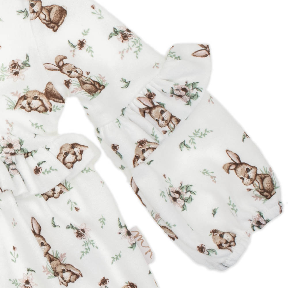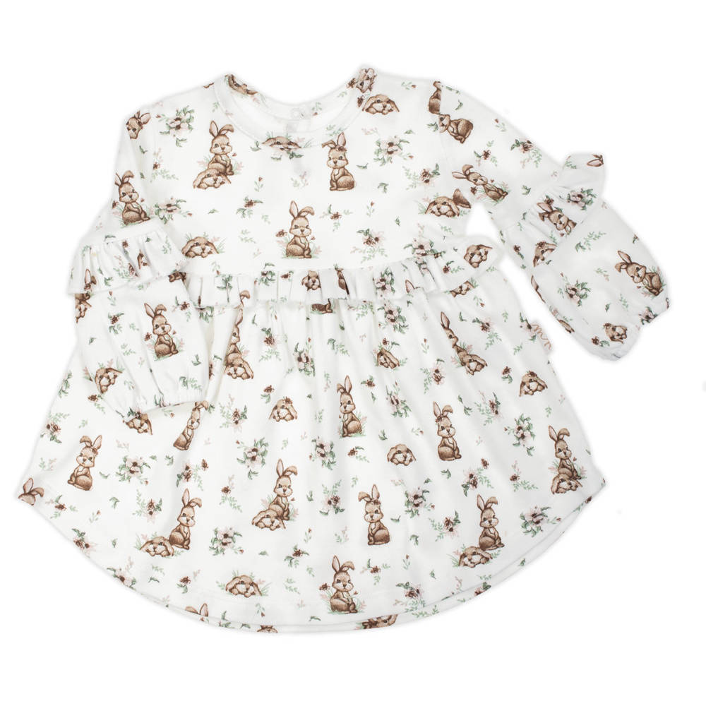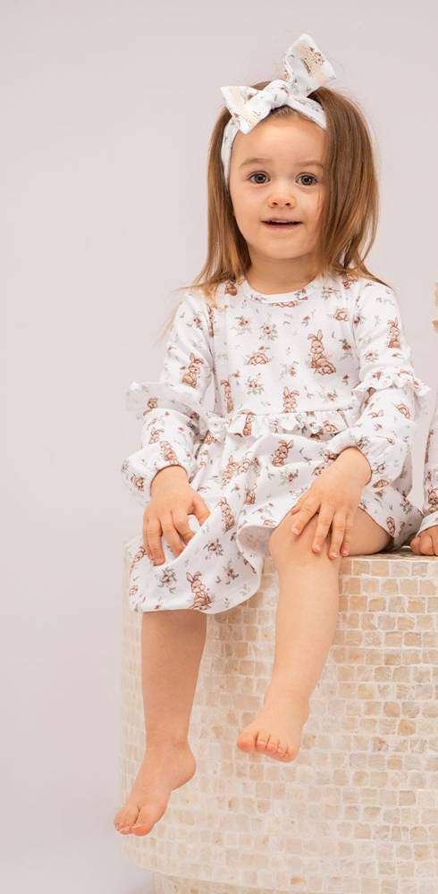 Dziewczęca sukienka w kolorze kremowym. Ozdobiona nadrukiem. Luźny fason nie krępuje ruchów. Sukienka zapinana jest na ramionach, co znacznie ułatwia ubieranie i rozbieranie maluszka. Zatrzaski wykonano z antyalergicznego, bezpiecznego tworzywa bez dodatku niklu. Doskonałym uzupełnieniem dla sukienki będzie kamizelka oraz opaska z kolekcji Bunia.