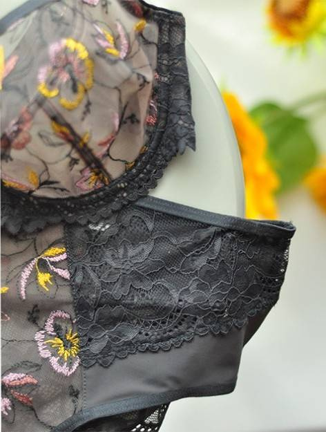 Biustonosz miękki z fiszbinami. Miseczki wykonane z beżowej siatki, na którą naszyty jest wzorzysty plen. Boczki z mikrofibry-wzmocnione fiszbiną, grafitowe ramiączka, bawet z koronki, środek zdobi zółta kokardka. Dedykowany dla średnich i dużych biustów.