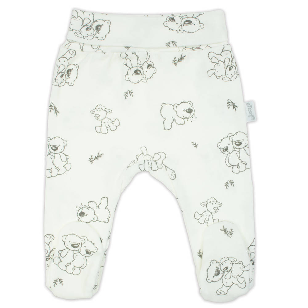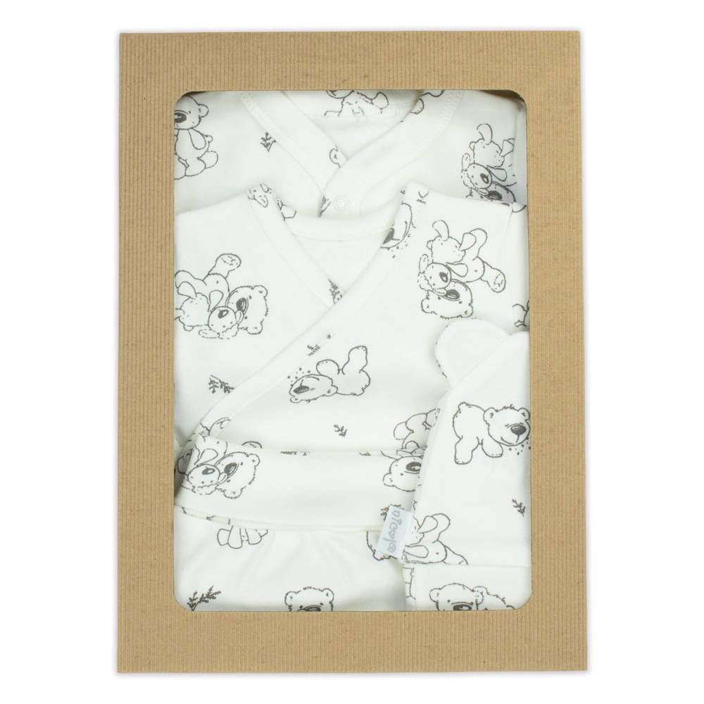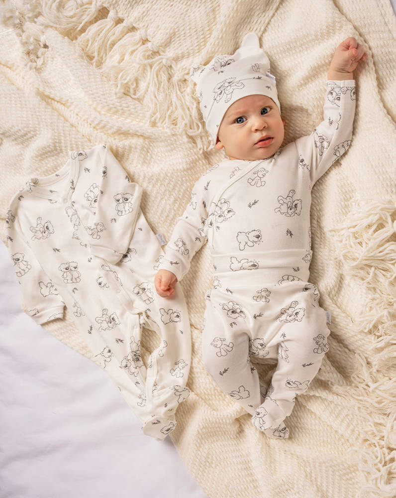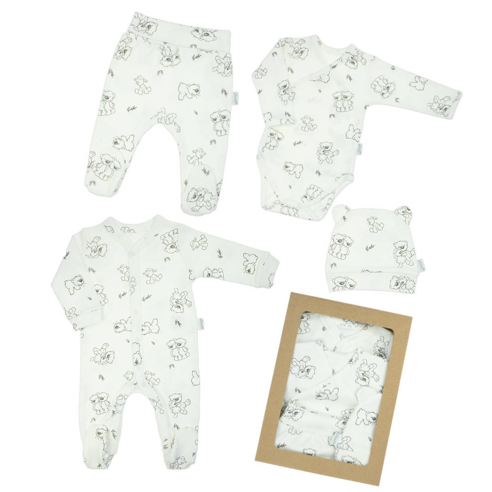 Komplet niemowlęcy, który składa się z półśpioszków, pajacyka, czapeczki i body. Body i pajacyk zapinane na napki. Zapakowana w  pudełko. Całość uszyta z mięciutkiej 100% bawełny, ozdobiona nadrukiem miśków.