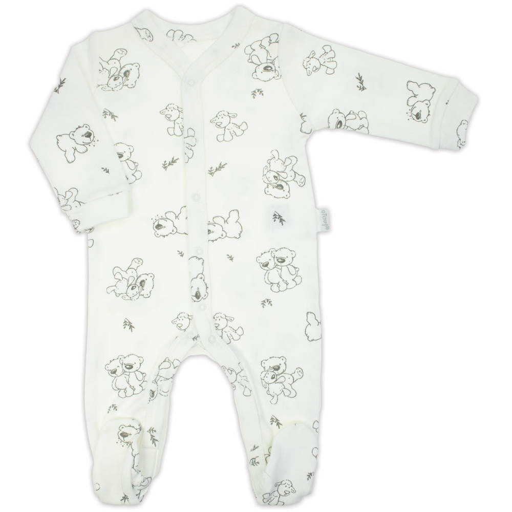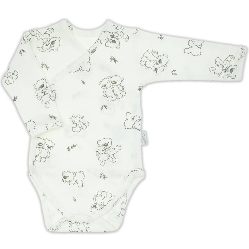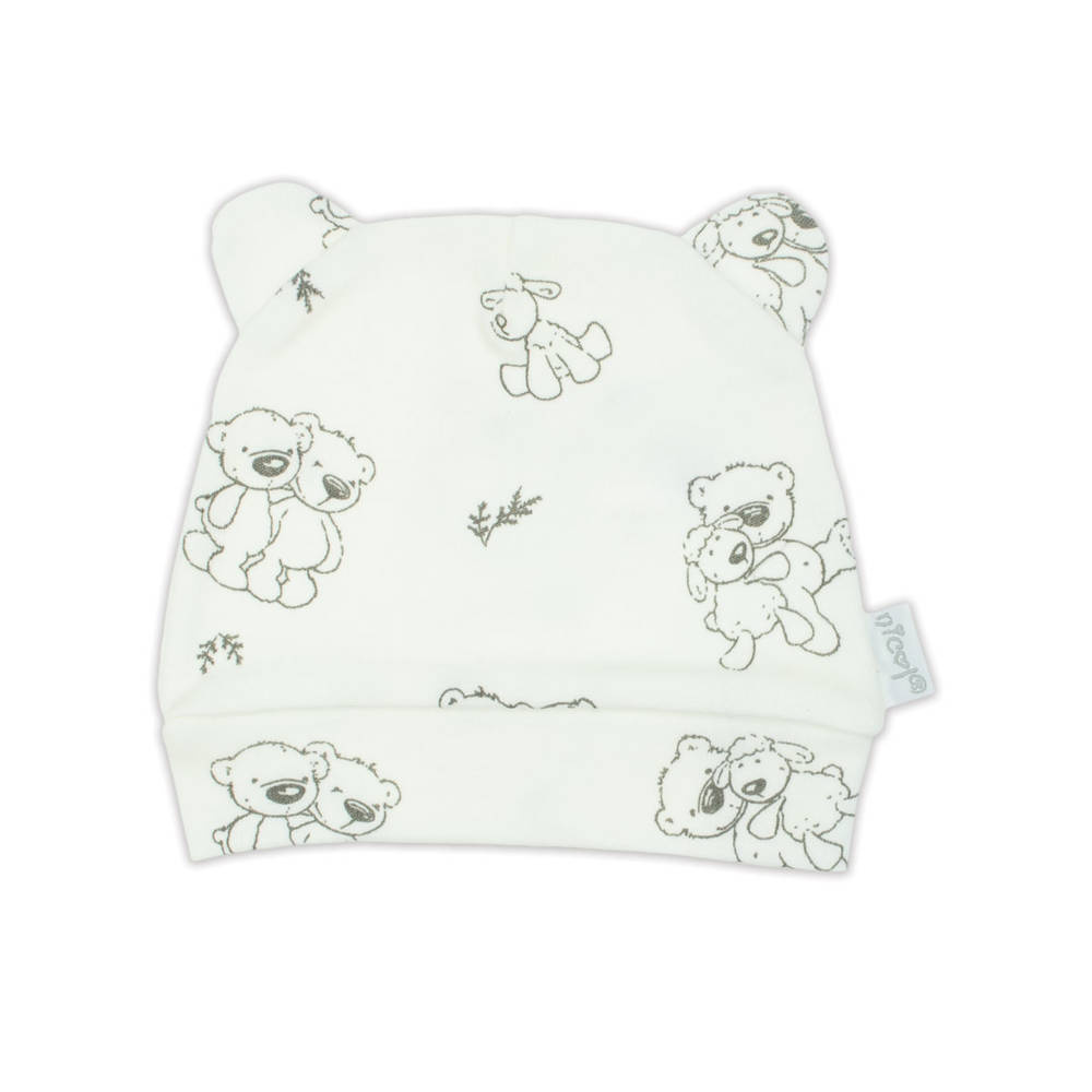 Komplet niemowlęcy, który składa się z półśpioszków, pajacyka, czapeczki i body. Body i pajacyk zapinane na napki. Zapakowana w  pudełko. Całość uszyta z mięciutkiej 100% bawełny, ozdobiona nadrukiem miśków.