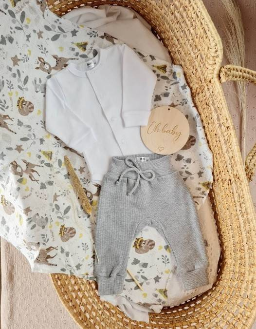 Efektowny komplet dla niemowląt. W którego skład wchodzi body rozpinane i spodnie. Całość wykonana jest z mięciutkiej bawełny. Doskonale sprawdzi się w pierwszych dniach życia maluszka.
