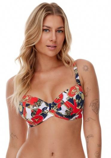Biustonosz bikini przeznaczony dla kobiet ze średnim i dużym biustem. Biustonosz wykonany z dzianiny w granatowo, czerwono białej kolorystyce, z letnim, motywem morskim. Posiada miękkie miseczki z modelującymi cięciami oraz jest usztywniony fiszbinami, dzięki czemu doskonale podtrzymuje biust. Ramiączka regulowane, nieodpinane. Szerokość ramiączek i typ zapięcia dopasowany do rozmiaru kostiumu. Miedzy miseczkami delikatna ozdoba dodająca uroku całości