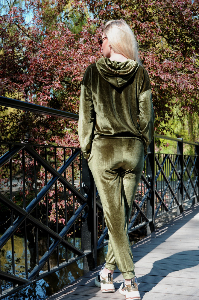 Przedstawiamy komplet dresowy, który sprawdzi się nie tylko na siłowni, ale również pięknie będzie prezentować się jako codzienna stylizacja w chłodne dni! Wykonany został z bardzo przyjemnego, welurowego materiału. Bluza dodatkowo posiada kaptur oraz duże logo uszyte ze złotej nitki.