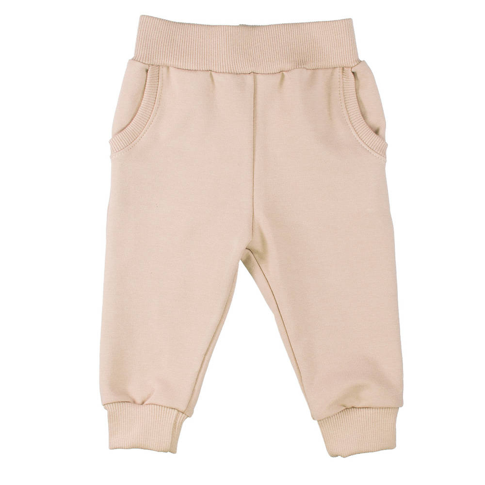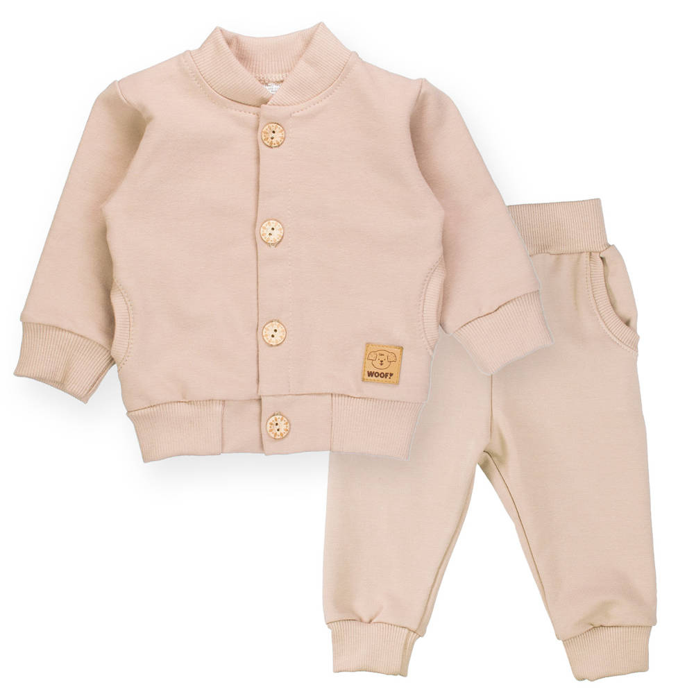 Komplet niemowlęcy z bluzą i spodenkami. Wykonany z cienkiej bawełnianej dresówki z elastanem. Bluza bomberka zapinana na drewniane guziczki, kieszonki wykończone ściągaczami. Spodnie na gumce z kieszonkami po boku wykończone ściągaczami Nogawki spodni wykończone ściągaczami. Idealnie sprawdzi się podczas spacerów w chłodniejsze dni.