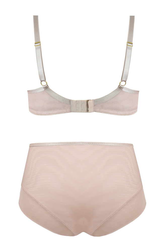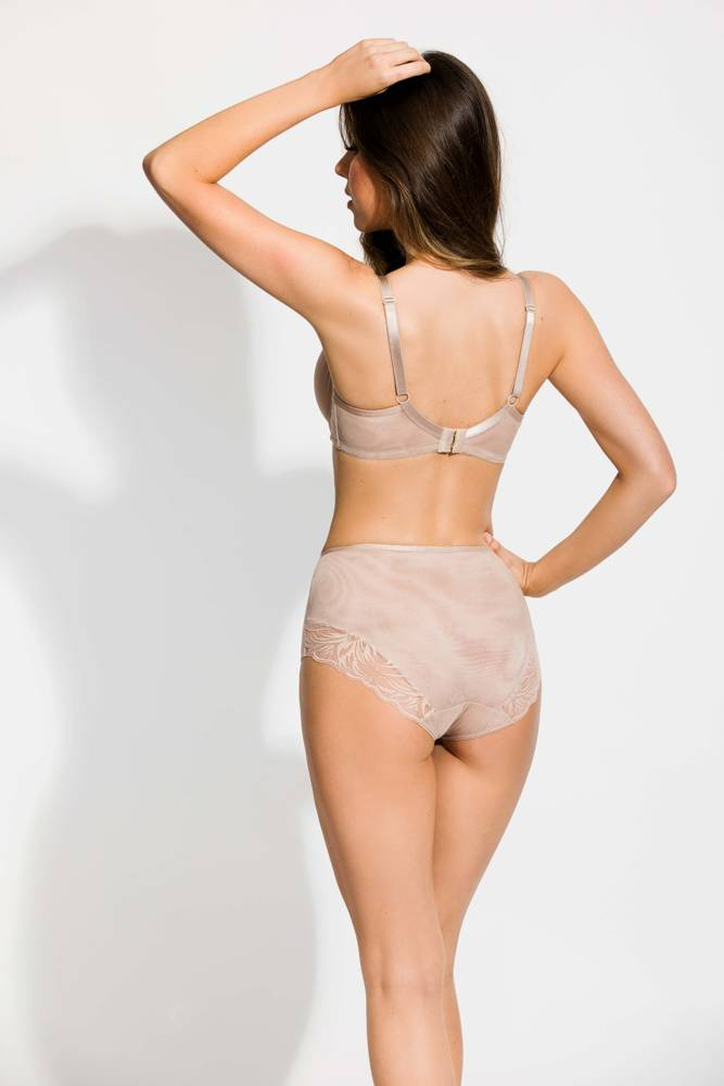 Biustonosz miękki z paseczkami na dekolcie. Miseczki wykonane z beżowego tiulu siatki, górna część i bawet wzbogacony koronką. Paseczki z regulacją, nie odpinają się. Boczki z fiszbiną, obwód z podwójnej siatki.