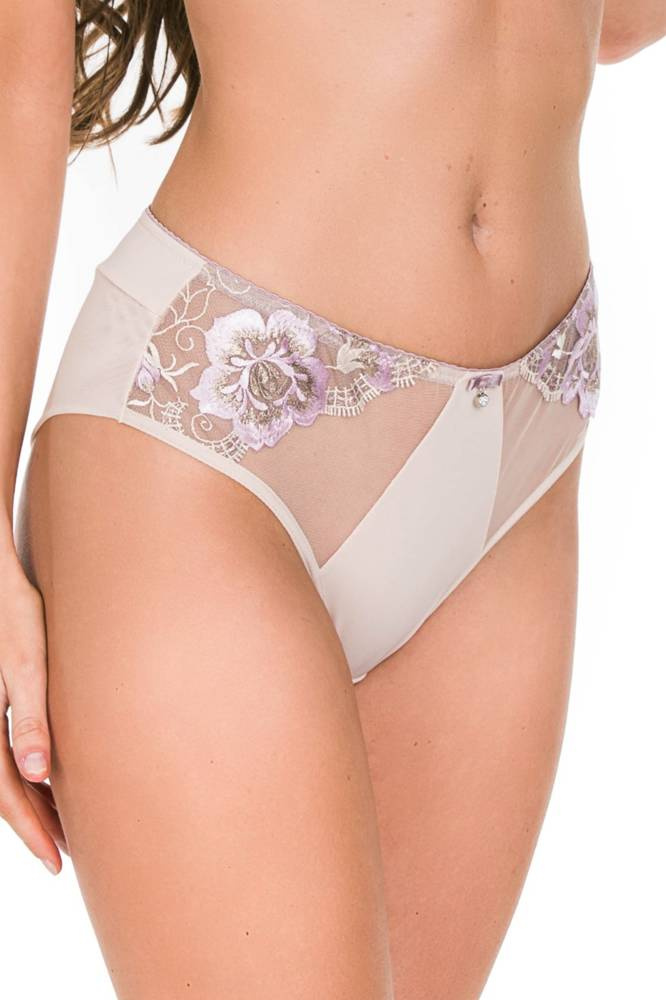 Figi wysokie o klasycznym kroju. Przód wykonany z siatki ozdobionej koronką, środek elastyczny, boki stabilne.