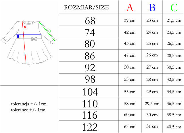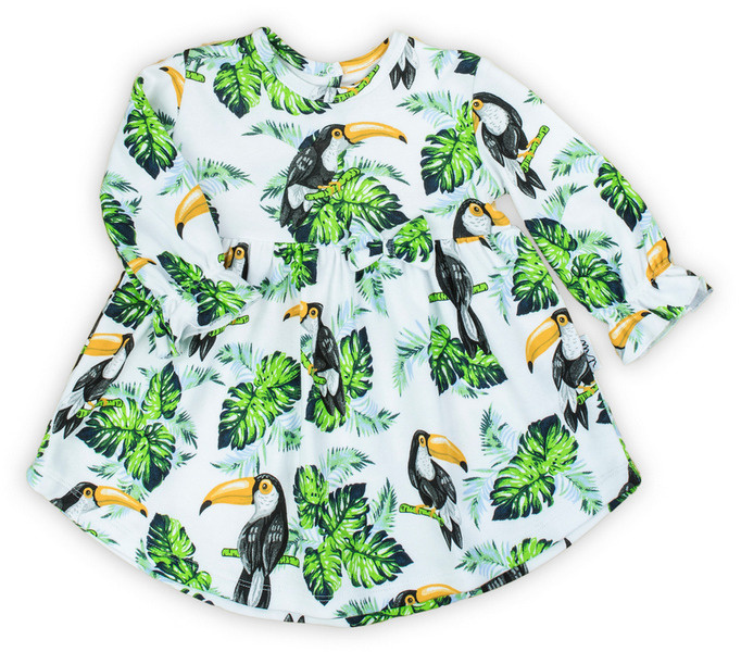 Dziewczęca sukienka z wysokogatunkowej bawełny. Ozdobiona nadrukiem. Luźny fason nie krępuje ruchów. Sukienka zapinana jest na plecach, co znacznie ułatwia ubieranie i rozbieranie maluszka. Zatrzaski wykonano z antyalergicznego, bezpiecznego tworzywa bez dodatku niklu. Doskonałym uzupełnieniem dla sukienki będzie kamizelka oraz opaska z kolekcji Tukan.