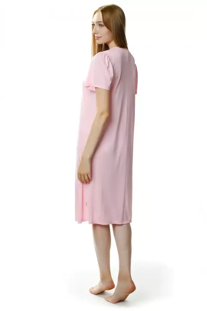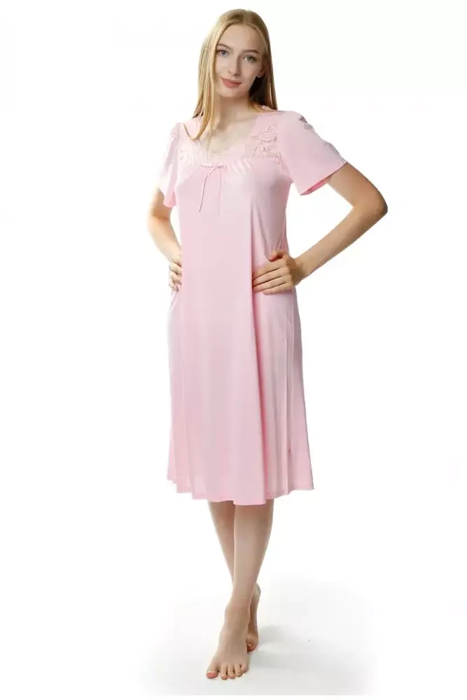 .Koszula nocna wykonana z dzianiny wiskozowej z krótkim rękawem o długości - za kolano. Elementem zdobniczym jest zastosowanie elastycznej, miękkiej koronki o motywie kwiatowym, która nadaje uroku i kobiecości. Całość dopełnia delikatna kokardka.