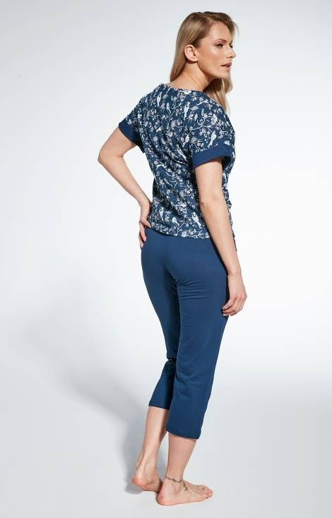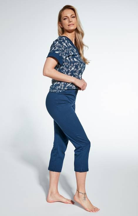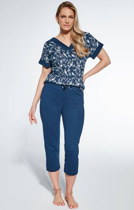 Piżama damska wykonana z wysokiej jakości bawełny. Koszulka wzorzysta z krótkim rękawem z dekoltem w kształcie litery V.