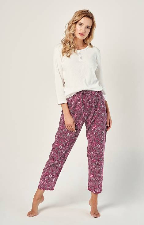 Piżama damska uszyta z wysokiej jakości bawełny. Koszulka jednolita z guzikami w ażurowy prążek.