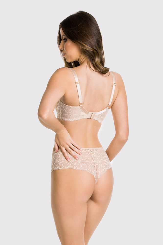 Figi o klasycznym kroju. W całości wykonane z delikatnej koronki, tył płasko wykończony, bawełniany klin.