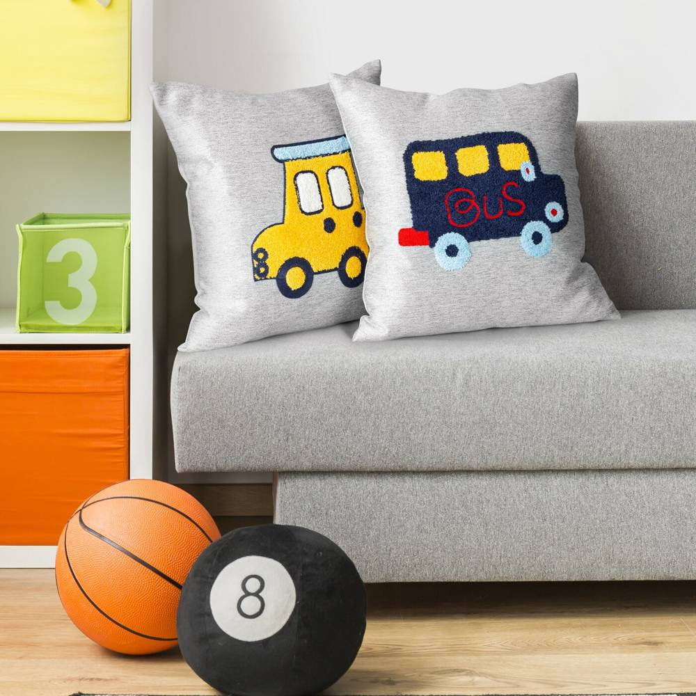 Poszewka z samochodem haftowanym puszystą nicią znakomicie ożywia wnętrze pokoju dziecięcego. Samochodzik wyróżnia się na tle szarej, melanżowej tkaniny z lekkim połyskiem. Zamek błyskawiczny wszyty w jednym z boków sprawia, że zmiana dekoracji trwa tylko krótką chwilę.