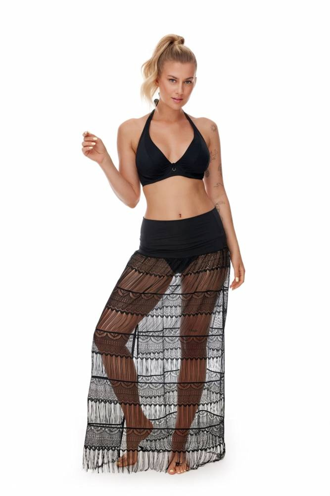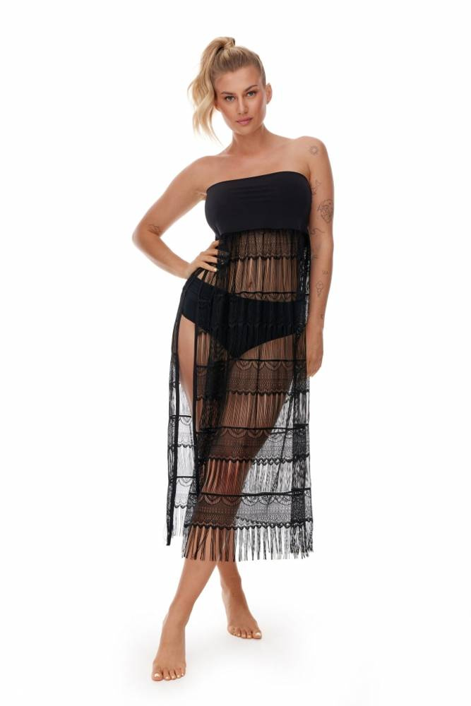 Czarne, plażowe pareo w formie tuniki w stylu Boho. Elastyczny top z dekoltem typu bandeau. Część spódnicowa wykonana z przezroczystej koronki z kokieteryjnym wycięciem oraz wykończona frędzlami. Może być noszone na dwa sposoby, w formie sukienki lub jako spódnica. Propozycja idealna zarówno na plażę oraz jako dodatek do letniej stylizacji.