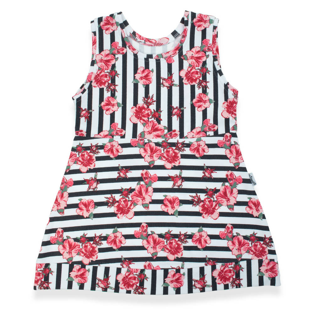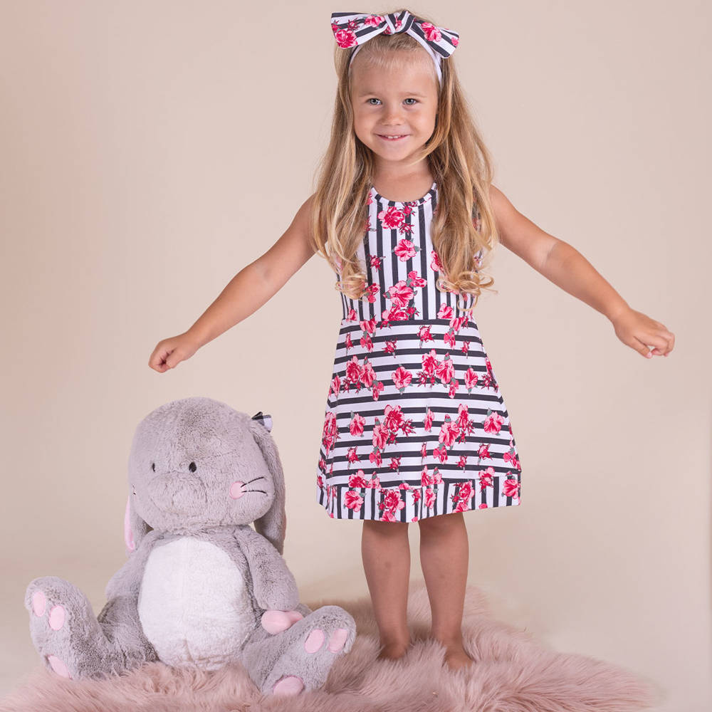 Dziewczęca sukienka w paski. Ozdobiona nadrukiem w rośliny. Luźny fason nie krępuje ruchów.