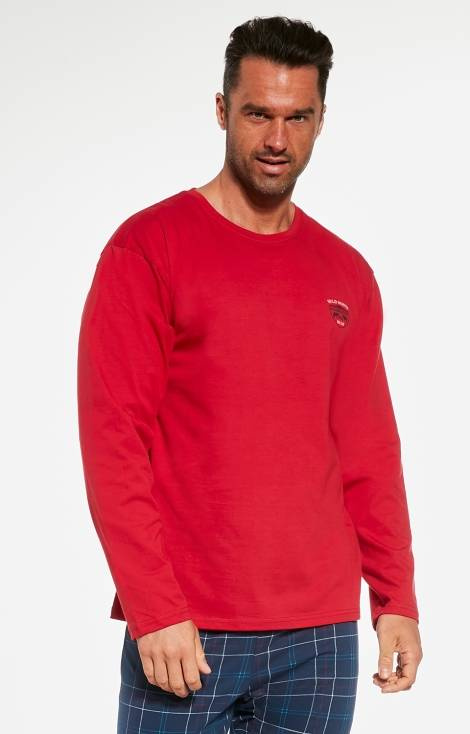 Piżama męska uszyta z wysokiej jakości bawełna. Bluzka z długim rękawem z okrągłym dekoltem. Do kompletu długie, wzorzyste spodnie.