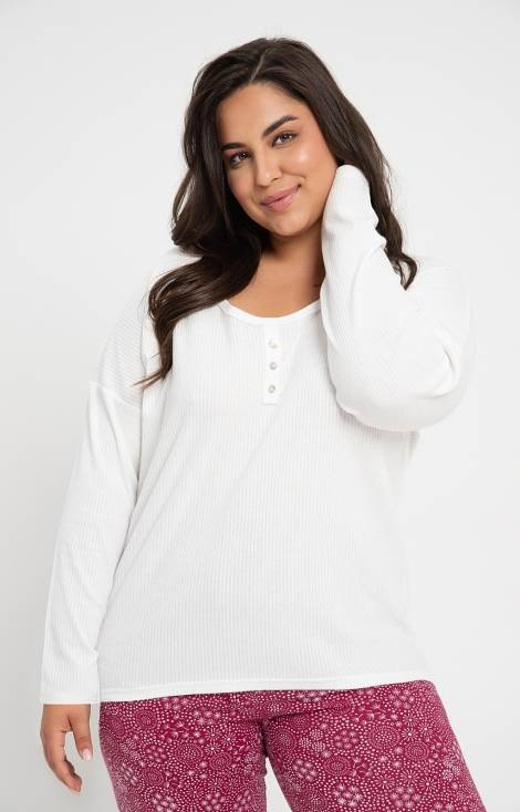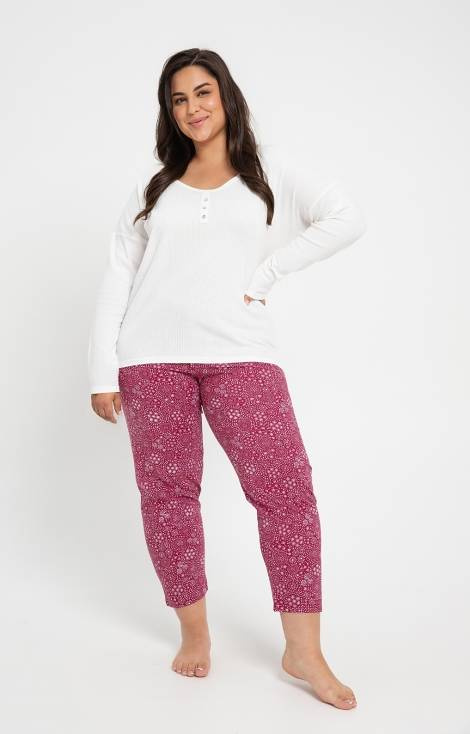 Bawełniana piżama damska. Koszulka jednolita w prążek z długim rękawem , dekolt okrągły ozdobiony guzikami . W komplecie wzorzyste spodnie 7/8.