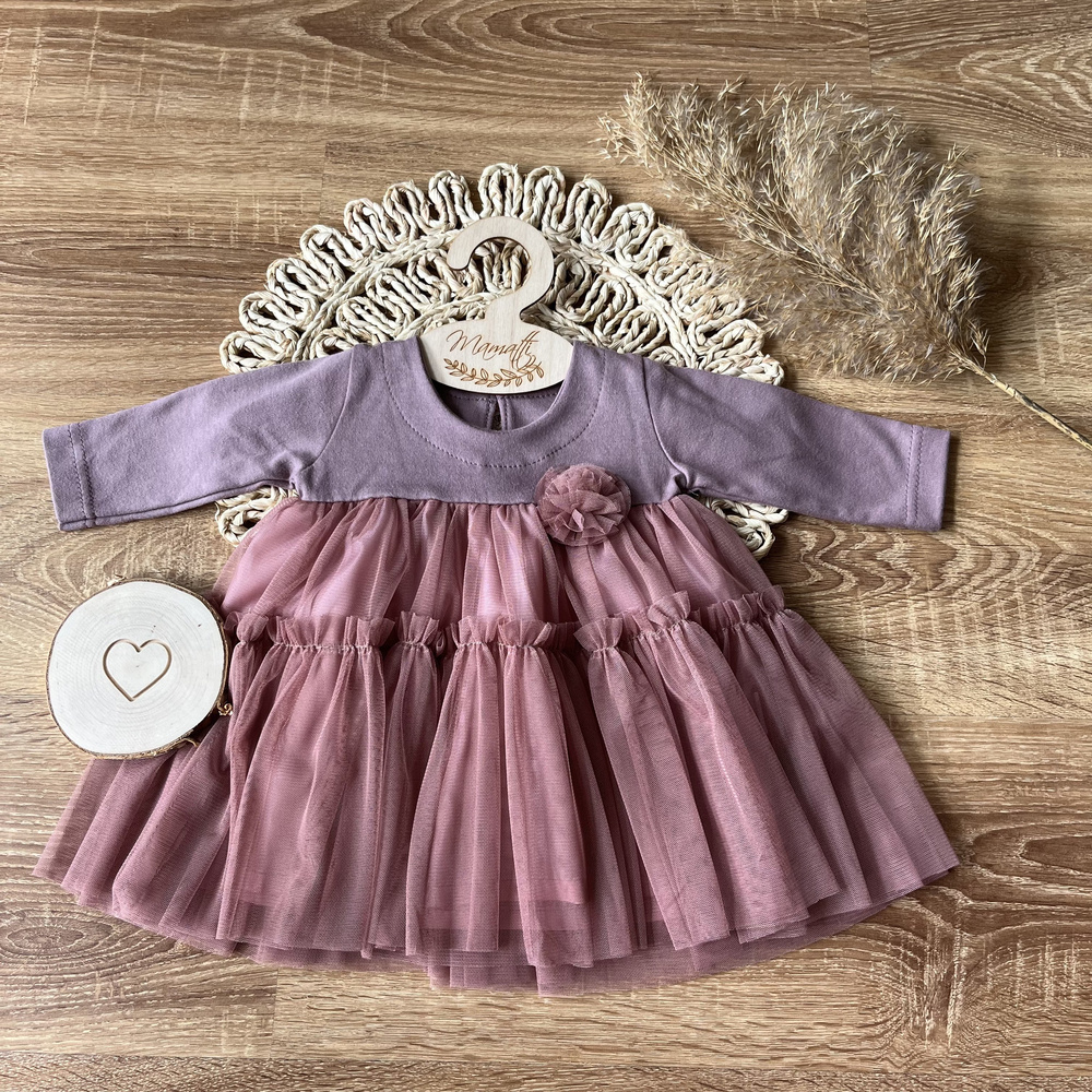 Sukienka niemowlęca połączona z body. Model rozkloszowany z długim rękawem. Uszyta z miękkiej i przyjemnej w dotyku bawełny. Idealna kreacja dla małej damy.