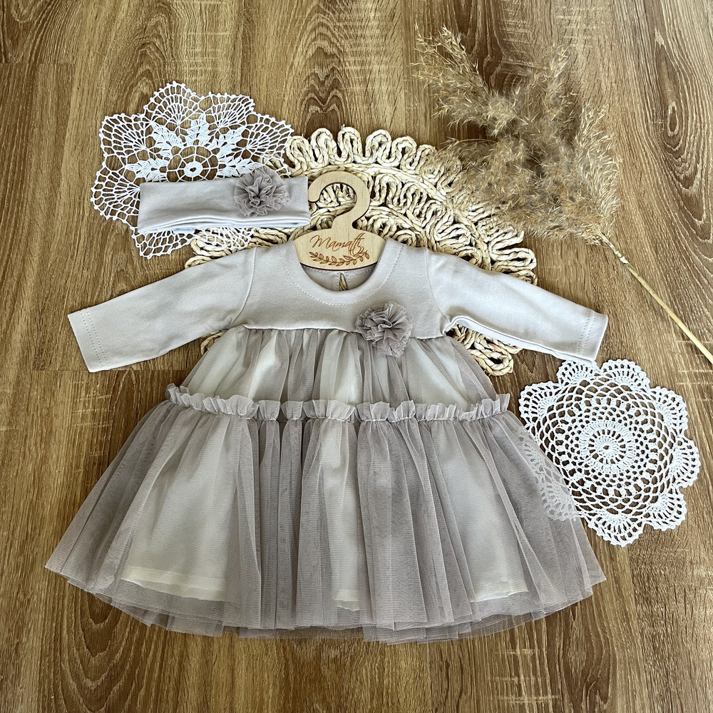 Urocza sukienka z długim rękawem. Wykonana w 100% z bawełny. Wykończona delikatnym tiulem.