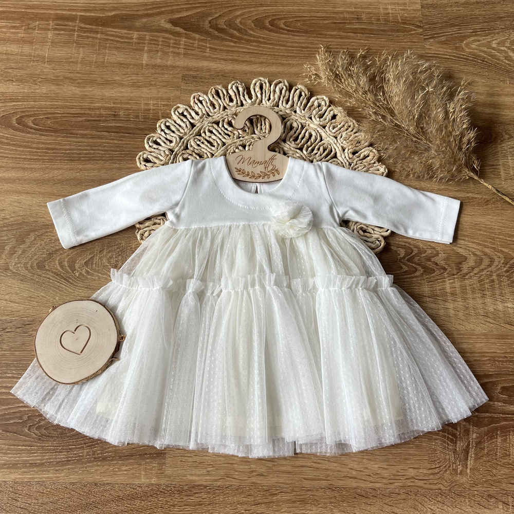 Urocza sukienka z długim rękawem. Wykonana w 100% z bawełny. Wykończona delikatnym tiulem.