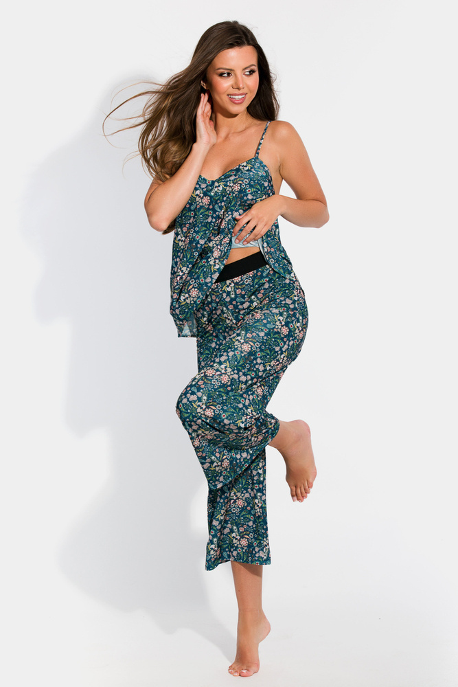 Zwiewny komplet z mikrofibry. Koszulka z wąskim ramiączkiem i spodnie o długości 7/8 z szeroką nogawką. Całość wykonana z lekkiej mikrofibry w kwiatowy wzór. Spodnie z czarną gumą w pasie. Ramiączka z regulacją. Fason luźny.