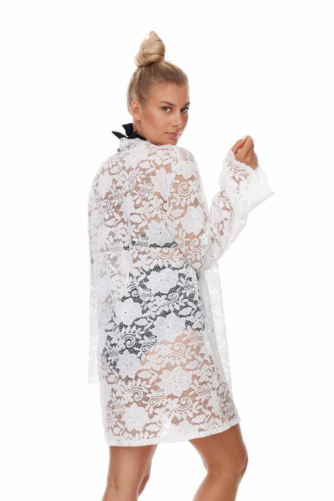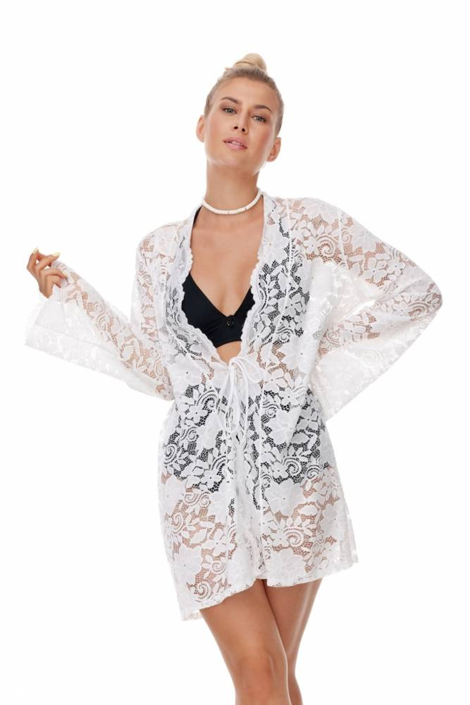 Eleganckie biały szlafroczek w formie parea. Rękawy rozszerzane, wiązany w pasie. Idealna propozycja na uzupełnienie plażowej stylizacji.