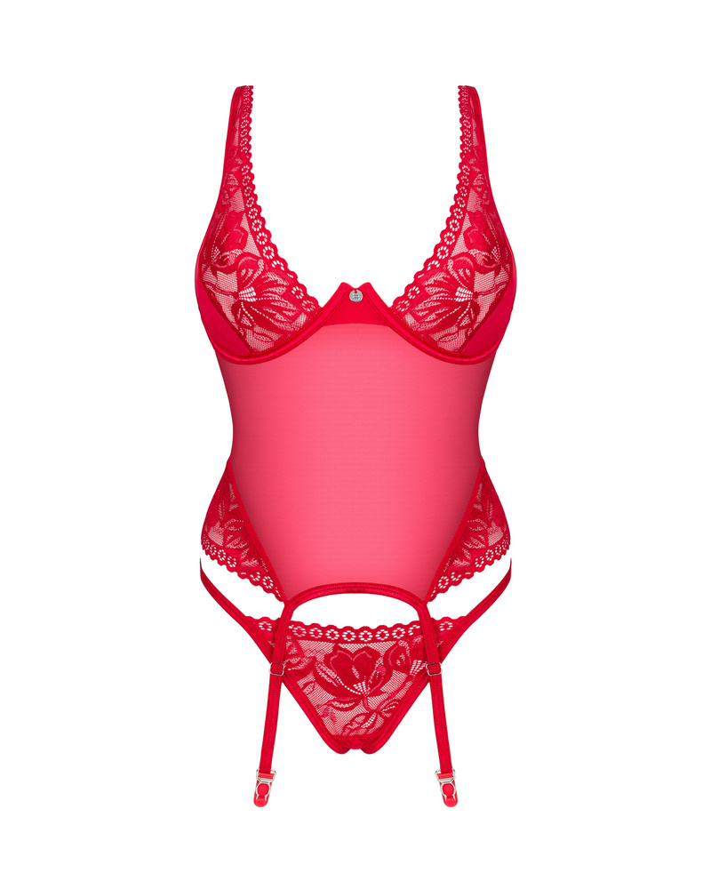 Elegancki gorset damski z miękkimi miseczkami z fiszbinami. Całość wykonana z miękkiej koronki i elastycznej siateczki. Paski do pończoch nieodpinane z regulacją. Do kompletu stringi. Pończochy nie są w zestawie.