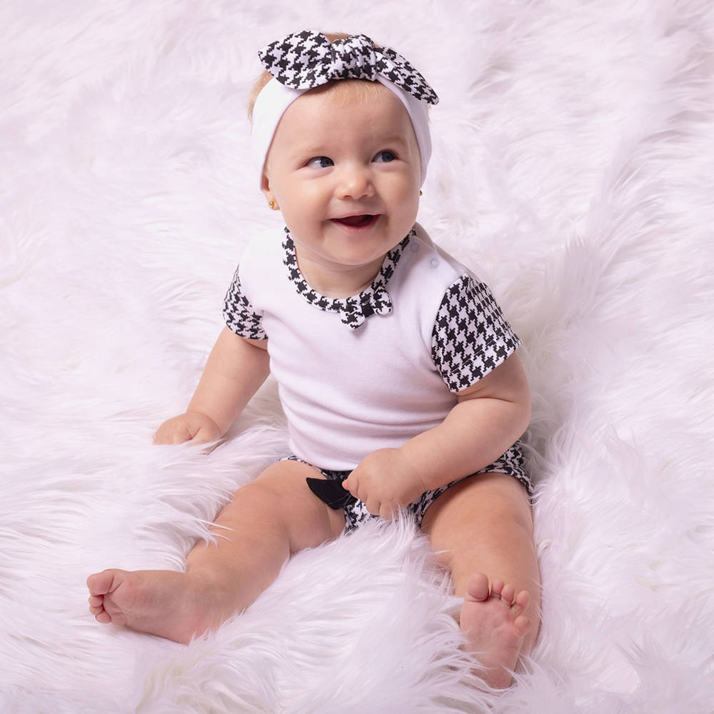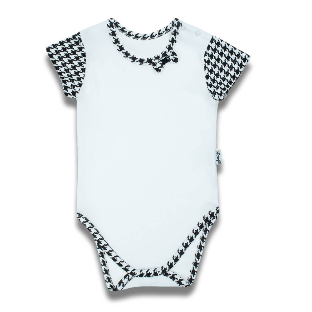Body z krótkim rękawem dla dziewczynki, uszyte z białej bawełny z rękawkami, lamówką w wzór pepitka, dodatkowo przód ozdobiony kokardką również w wzór pepitka. Zapinane na bezniklowe napy na ramieniu i w dole. Materiał posiada certyfikat Oeko-Tex Standard 100 Tekstylia godne zaufania.