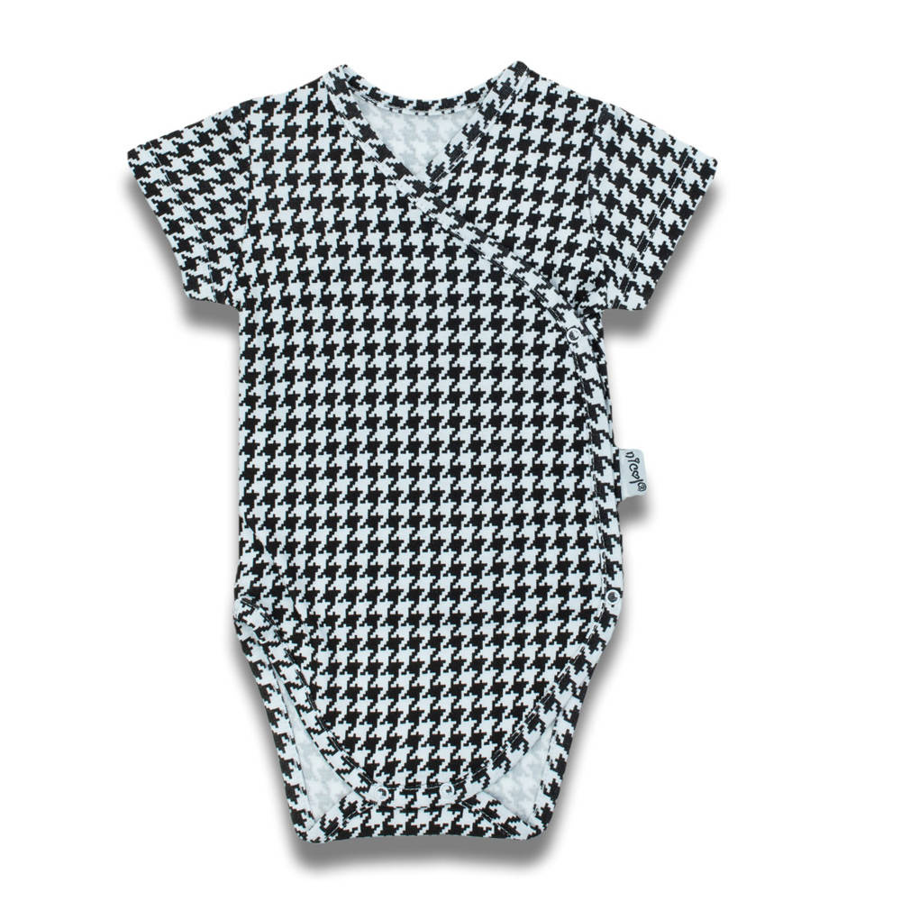 Body kopertowe z krótkim rękawem, uszyte z drukowanego materiału - wzór pepitka. Model ten polecany jest dla noworodków, ponieważ zastosowane zapięcie ułatwia ubieranie dziecka. Zapinane na bezniklowe napy. Materiał posiada certyfikat Oeko-Tex Standard 100 Tekstylia godne zaufania.