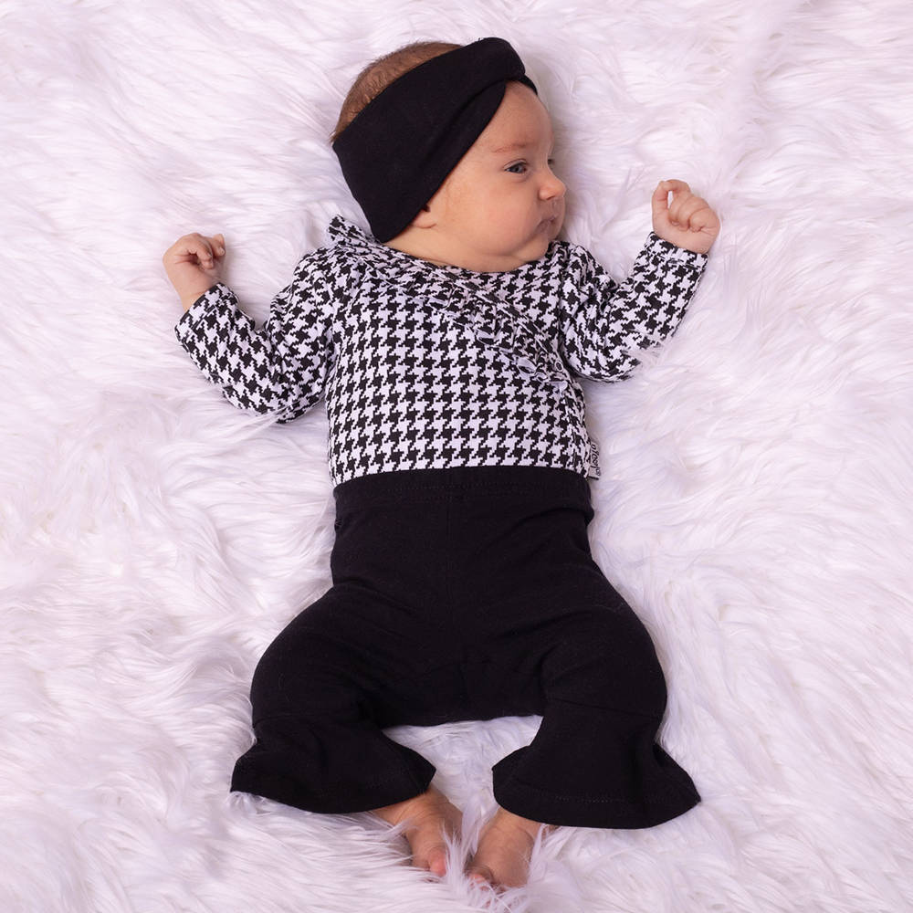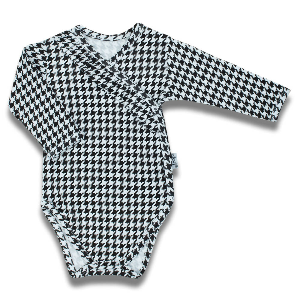 Eleganckie body z długim rękawem zapinane kopertowo na bezniklowe napy, wzór pepitka. Przód ozdobiony falbanką. Model ten bardzo ułatwia ubieranie maluszka. Materiał posiada certyfikat Oeko-Tex Standard 100 Tekstylia godne zaufania.