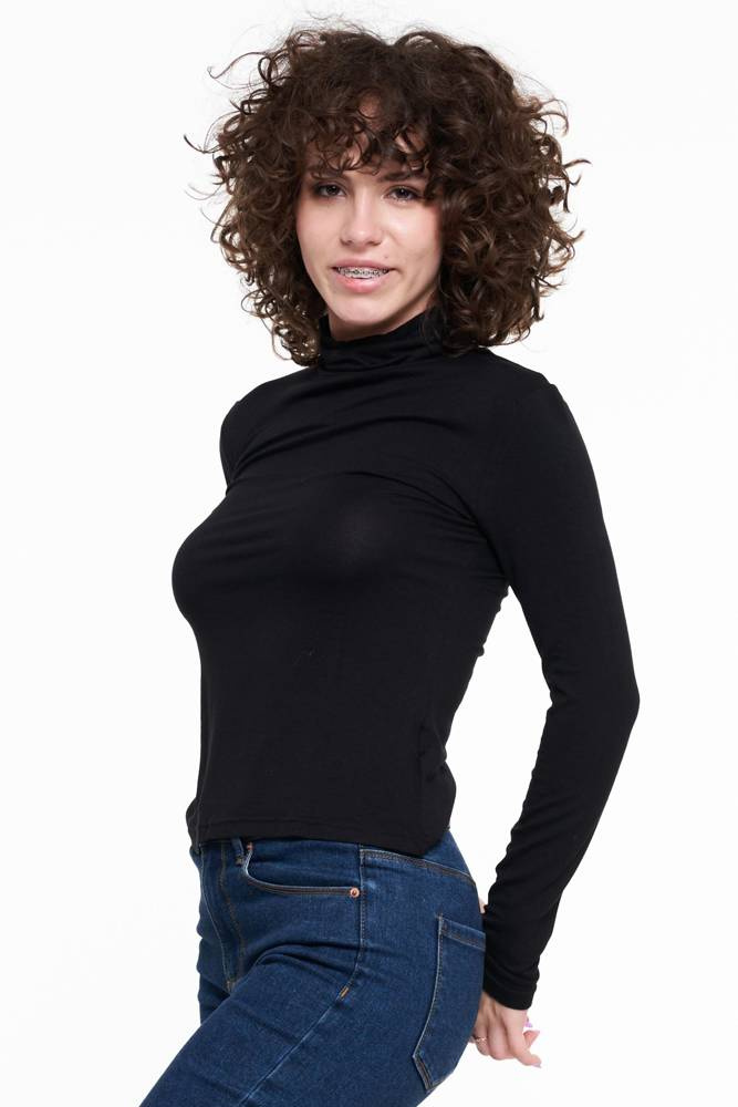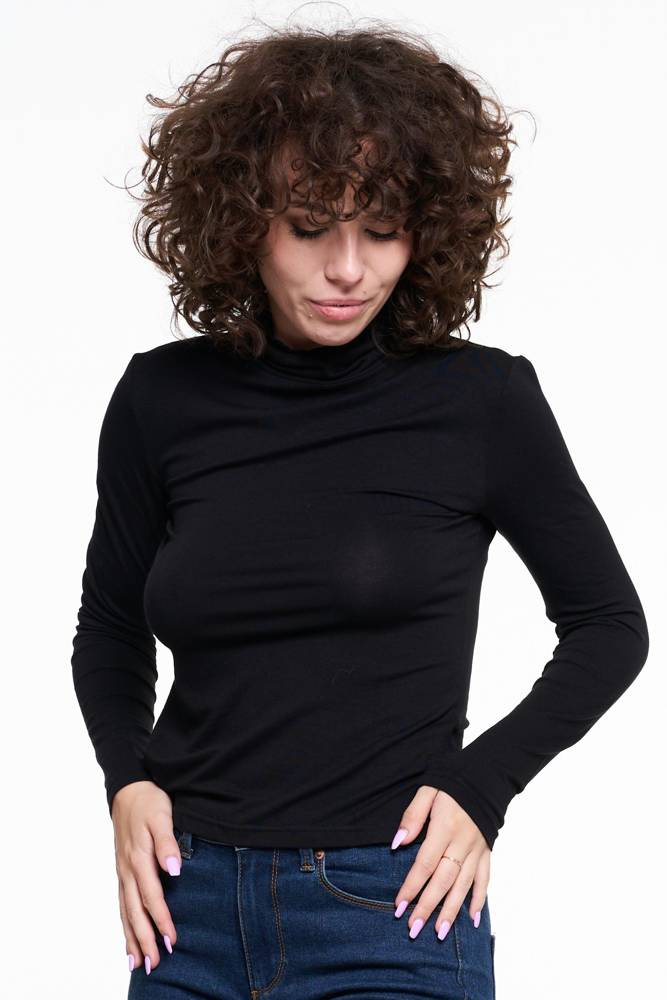 Wygodna, gładka bluzka damska z golfem. Wykonana z bardzo miłego, przyjemnego w dotyku materiału. Lekko dopasowany krój bluzki zapewnia wygodę i wysoki komfort podczas noszenia. Niezwykle kobieca bluzka typu golf wykończona prosto, bez ściągaczy z długimi rękawami. Dzięki takiej bluzce stworzysz wiele casualowych i eleganckich stylizacji.
