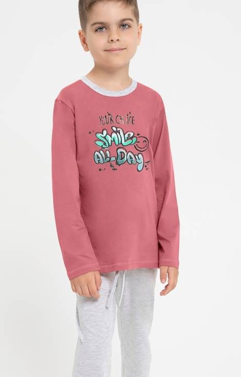 Koszulka z długim rękawem z przodu nadruk, dekolt okrągły. Spodnie długie, w kontrastującym kolorze.