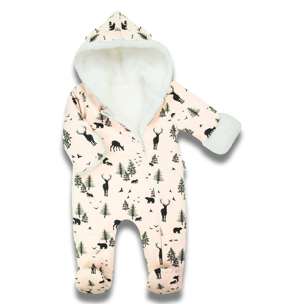 Pajac ocieplany wykonany z zewnątrz z drukowanej bawełny dresowej. Wzór leśny przedstawiający zwierzęta: niedźwiedź, jeleń, sarna, ptaki pośród drzew. Podszyty został futerkiem w kolorze kremowym, co sprawia, że ubranko idealnie nadaje się na chłodne dni. Całość zdobi kaptur z uszkami. Ubranko posiada zawijane rękawy aby na dworze ochronić rączki dziecka przed zimnem. Pajac zapinany jest na wygodny zamek - ułatwi to ubieranie. Materiał jest całkowicie bezpieczny dla skóry dziecka.