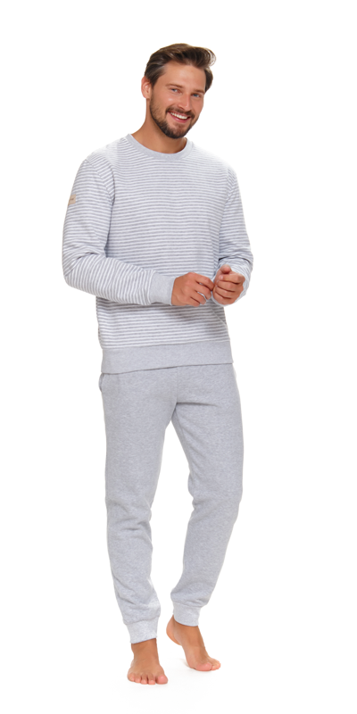 Klasyczna piżama męska z długim rękawem w pasy, uszyta z grubej bawełny intelook, dekolt okrągły. Do kompletu długie jednolite spodnie zakończone ściągaczem z kieszeniami