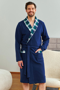 7366 Doctor Nap | Szlafrok męski premium granatowy z wykończeniem w kratę – 100% bawełna - navy blue